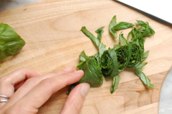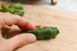 Arrange the leaves into a neat pile in the center of your cutting board. Tightly roll the leaves into a cigar shape and hold secure with one hand. |